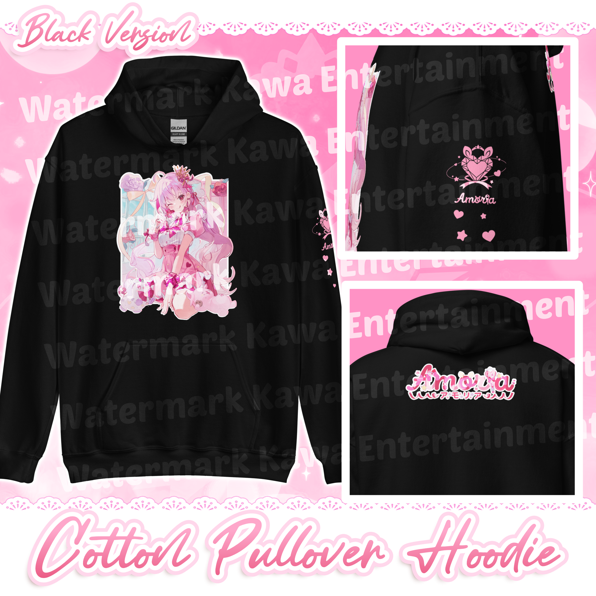 A Cotton Hoodie with printing in three areas- the front, shoulder, and back. Available in both Black and Pink.